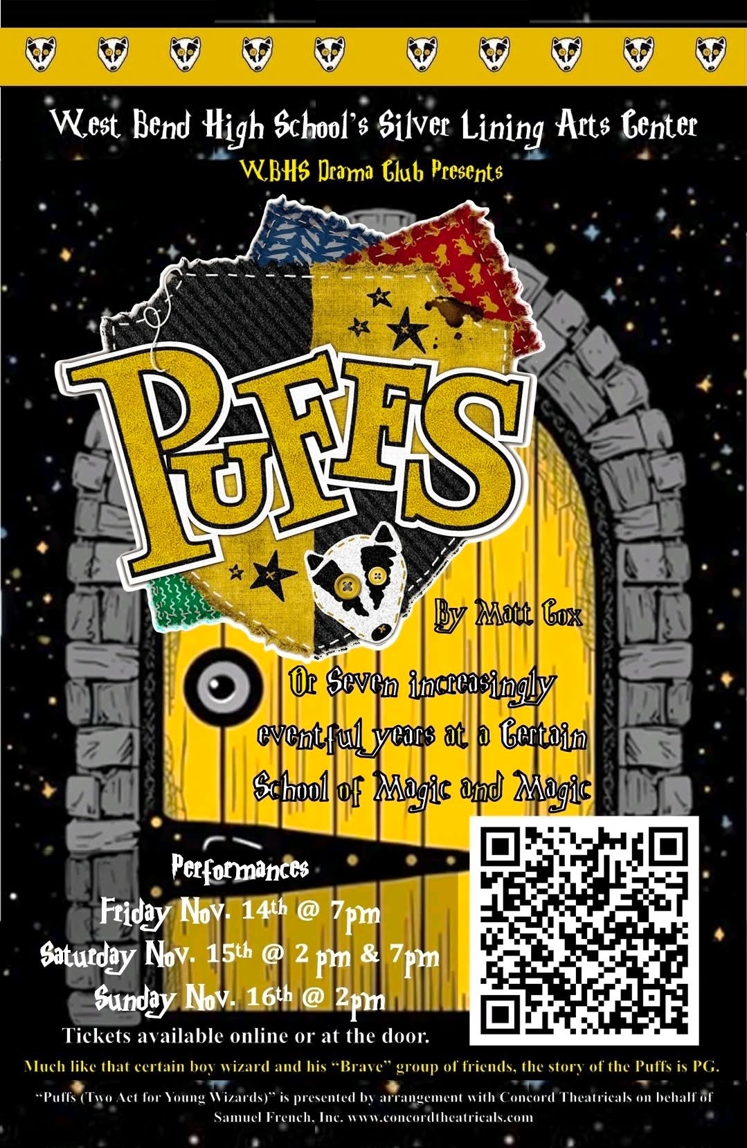 Puffs is the fall play from the WBHS Drama Club, with performances on Friday, November 14; Saturday, November 15; and Sunday, November 16. Tickets are available by using the QR code on the image or at the door.